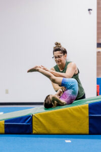 For “Parent” & Me classes, the parent may wear socks, but no shoes of any kind. Also, only one “Parent” can be in the gym area during the class for each gymnast. Parents are also not allowed to carry a baby through the gym, they may have the baby in a car seat or stroller close to the circuit the older child is training in. “Parents” are also never allowed to do any gymnastics.